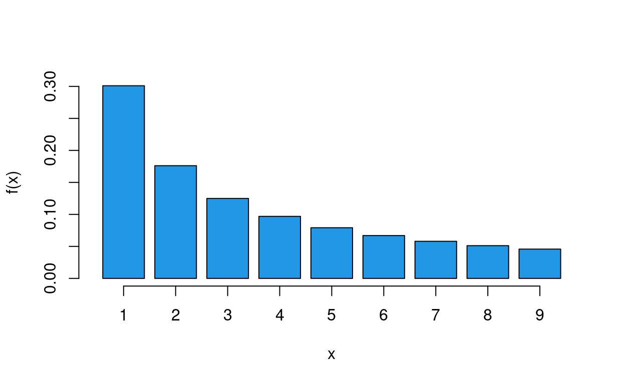 \[\begin{equation}p_X(x) = \begin{cases}\log_{10}(1+\frac 1x),& x=1,2,\ldots,9\\ 0,&\text{otherwise.}\end{cases}\end{equation}\]