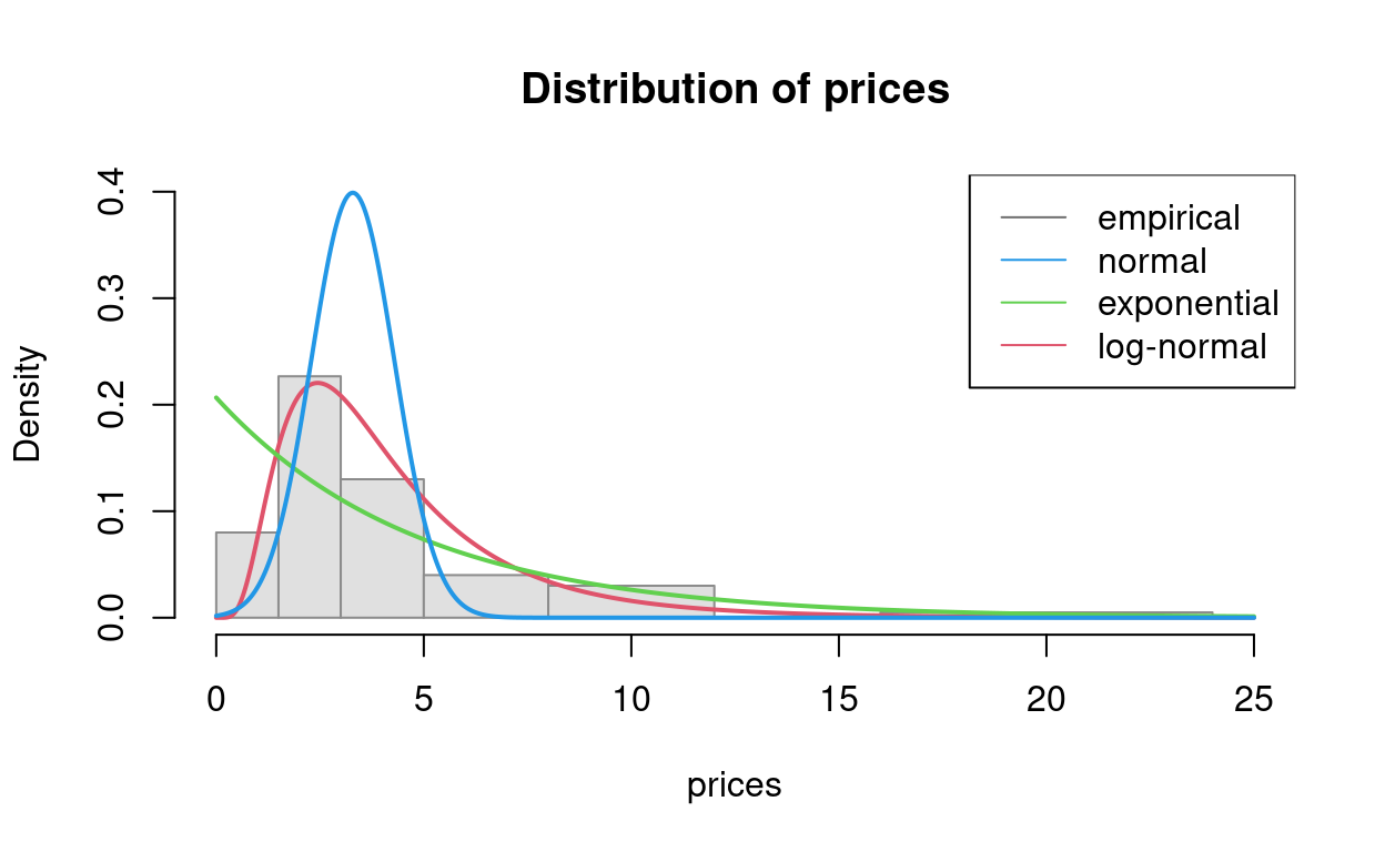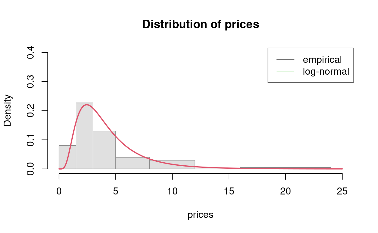 Recall that in our last case study, we modeled the first digit of the sample of supermarket prices with the Benford’s law. This time, let us model the prices as realizations of a continuous random variable \(X\) following a continuous distribution law.